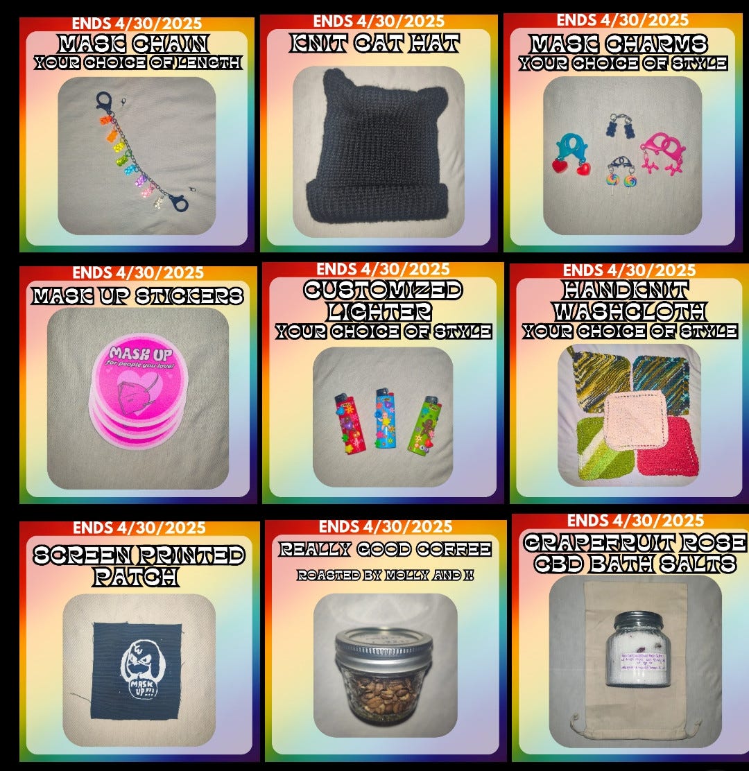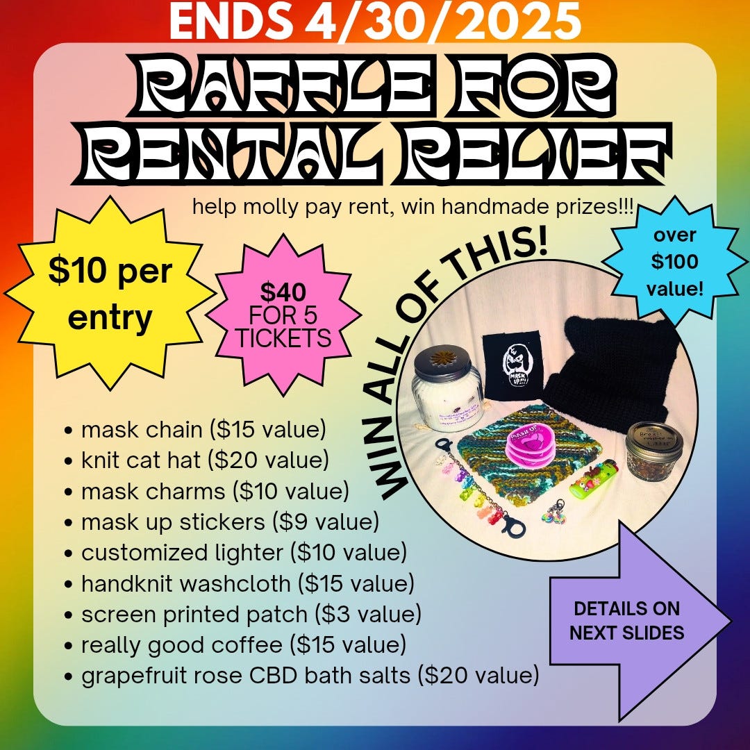 in case you missed it, we’re having a raffle this month to raise funds for our dear friend molly, with really amazing handmade prizes made by the covidsaferpdx crew and molly!!