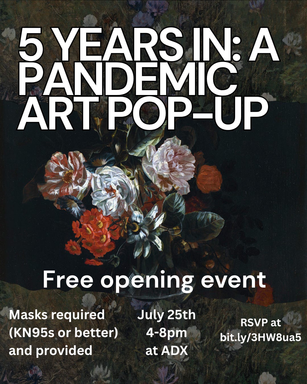 there will be a pandemic pop-up art show on july 25th from 4pm to 8pm featuring artists of all sorts of mediums, hosted by a community member and covidsaferpdx calendar helper! the show will be at ADX and will have a high-quality masks required and provided opening. to rsvp, go to https://bit.ly/3HW8ua5 !